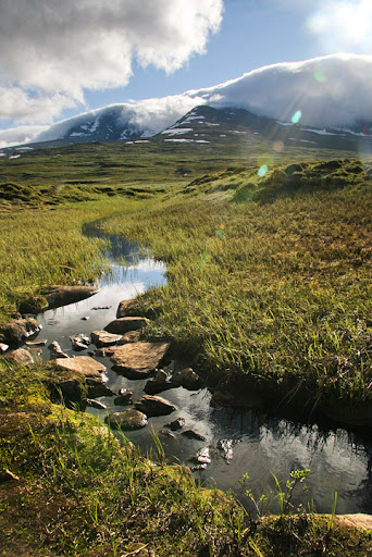 Schysst bild, vattnet ger bilden djup! Om man ska ge lite konstruktiv kritik så skulle det blivit ännu bättre med lite mer utrymme till vänster i bild, vattendraget känns något avklippt. Jag var själv i fjällen med kameran i somras och tog liknande bilder, önskade mig hela tiden mer vidvinkel för att få med mer!
